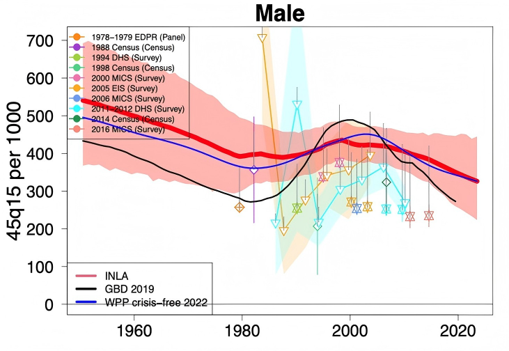 This project led by Professor Chao is about computing adult mortality rates in countries with high HIV prevalence using the Bayesian Hierarchical Model (BHM)☺~ This work aims to estimate the levels and trends in adult mortality for ages 15-59, i.e. the probability of dying between the ages of 15 and 59 years old by sex from 1950 to 2023.